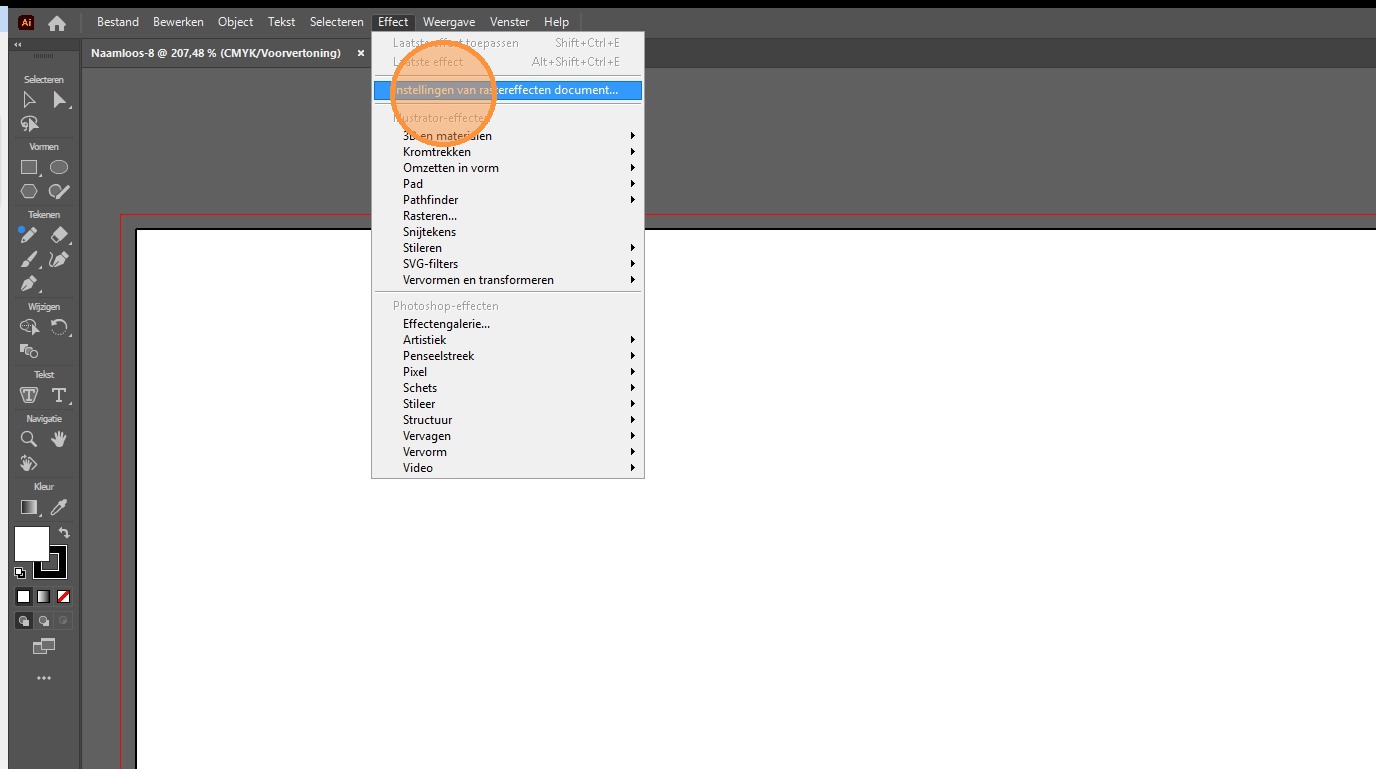 5. Onder effect kan je de optie Instellingen van rastereffecten document... aan klikken