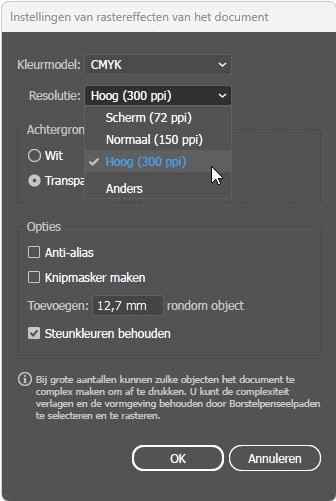 2. Onder Rastereffecten kan je de resolutie aanpassen. Wij raden aan om altijd hoog (300 ppi) aan te houden